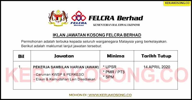 442021 April 4 2021 by Wanda Alwani JAWATAN KOSONG FELCRA dengan ini diwar-warkan kepada semua yang berminat. 312018 FELCRA merupakan sebuah Syarikat Government Linked Company GLC yang terlibat dalam aktiviti perladangan serta yang berkaitan dengannya. 422021 Iklan Kerja Kosong Kerajaan.